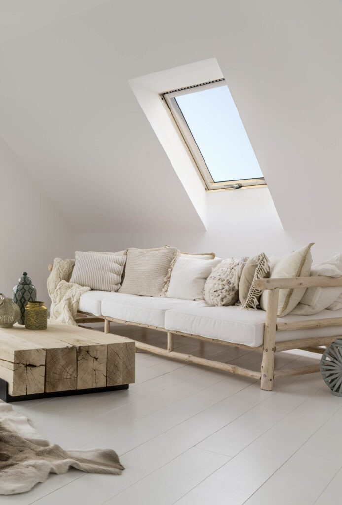 Les fenêtres sont fabriquées en pin, ce qui, en plus d’apporter une grande quantité de lumière naturelle, ajoute de la chaleur et une ambiance unique à la pièce. Les profils en bois doivent être imprégnés au moins une fois tous les 2 ans.