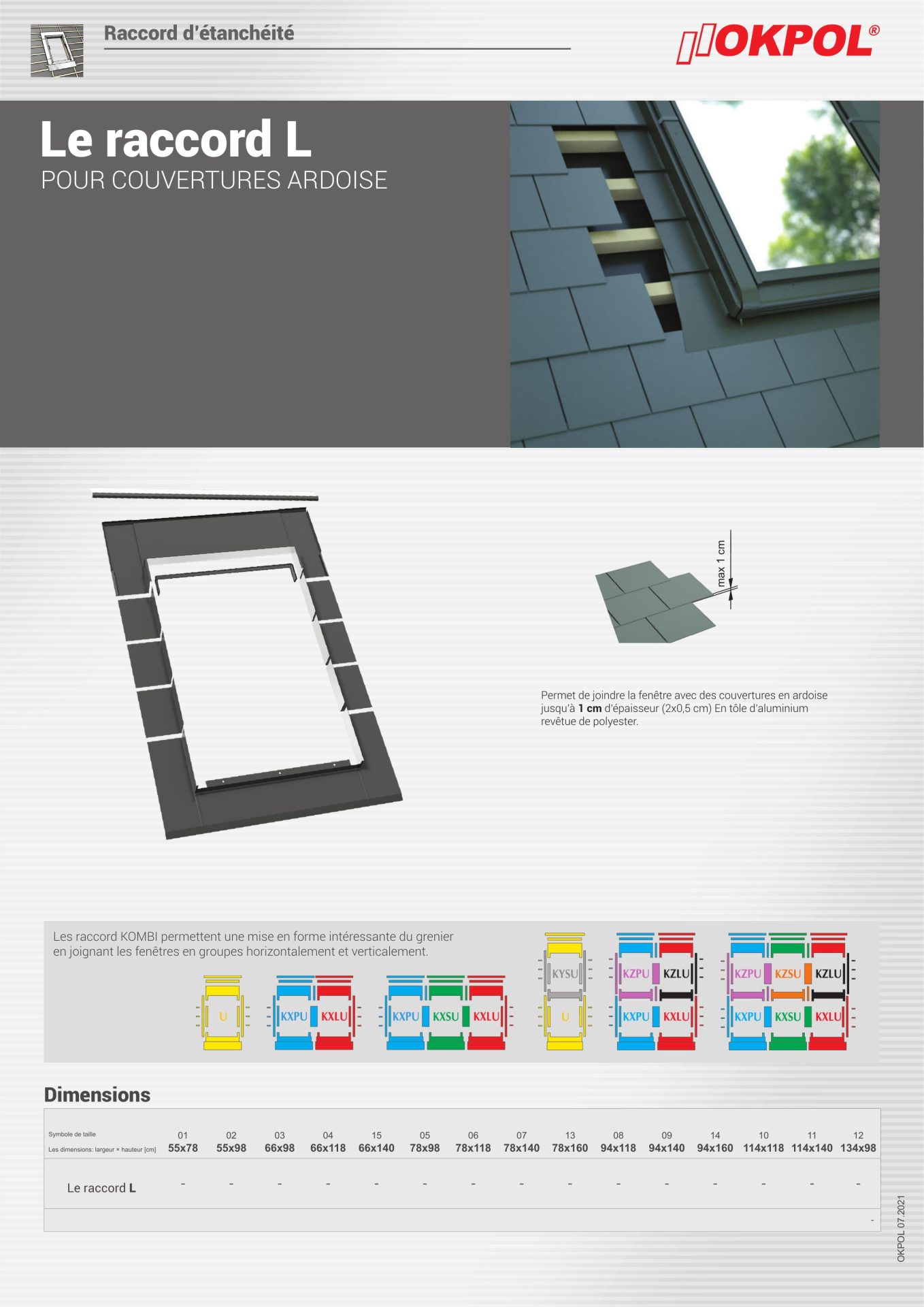 Le raccord est utilisé lors du montage de fenêtres de toit sur des toitures finies avec des couvertures ardoise à faible profil. Le bon choix du raccord permet de :